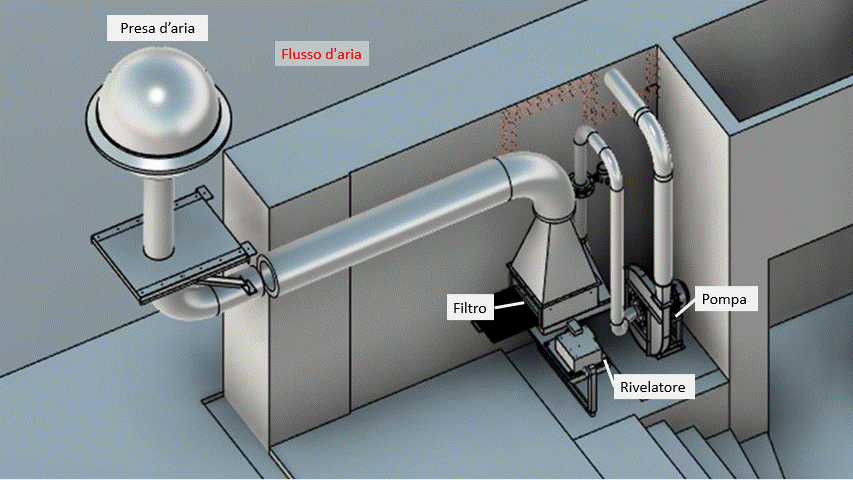 L'aria ambiente viene aspirata con una portata di 600 m³/h tramite una testa di aspirazione riscaldata, quindi convogliata attraverso un filtro di 40 × 50 cm. Una pompa regolata garantisce una portata costante. Sotto il filtro è installato un rilevatore al germanio ad alta purezza (HPGe, efficienza relativa 40%), che registra continuamente lo spettro gamma con un'elevata risoluzione energetica.